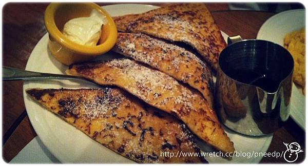 很喜歡剛端上來熱熱的感覺,撒上糖粉的土司沾上一點點糖漿吃下去真是大大的滿足耶!!!