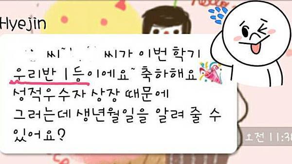 而且在11點多的時候,突然接到老師的kakaotalk....通知我是班上第一名!!!!!