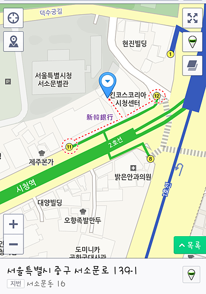 地鐵市廳站11號或是12號出口都可以使用,因為他是介於兩個出口中間的那個小路走進去
