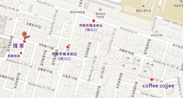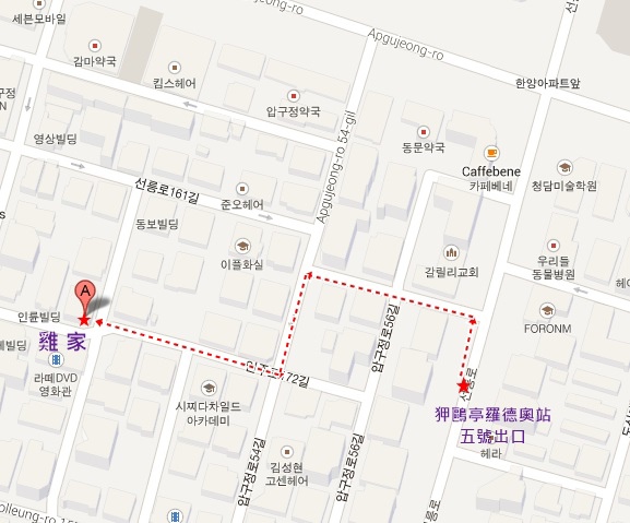 從狎鷗亭羅德奧站的五號出口走很近,下面是簡易小地圖